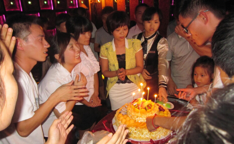 晚會(huì)的相關(guān)負(fù)責(zé)人手捧著生日蛋糕款款而來(lái),蛋糕放好之后,全場(chǎng)燈光熄滅,