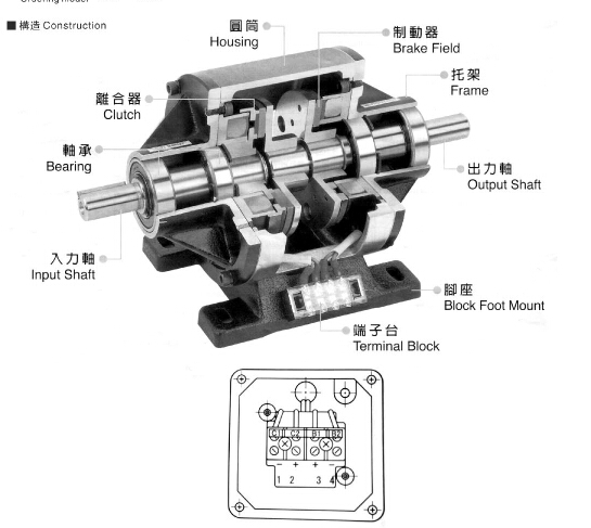 其之電樞與電磁剎車器則在同軸而形成的出力軸,電磁離合器之軛與電磁剎車器裝置于機(jī)架上。