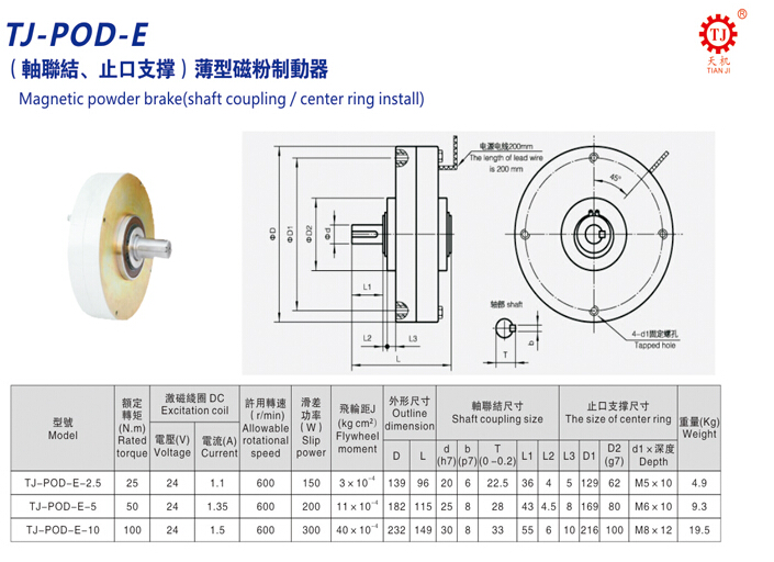TJ-POD-E型(軸聯(lián)結(jié)、止口支撐)超薄型磁粉剎車器